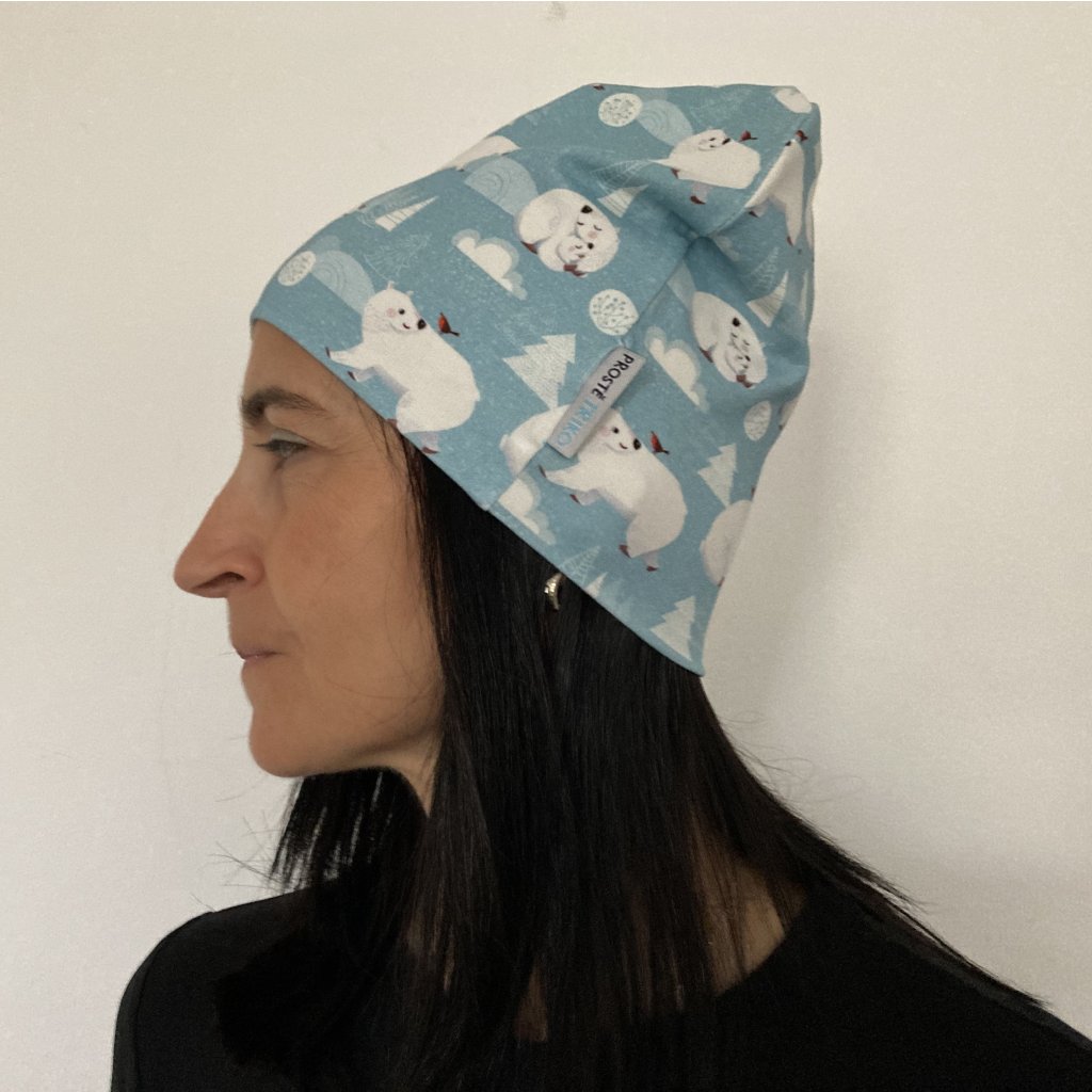 Krásná jemná čepice s ledními medvídky a malinkými ptáčky. Je vhodná jak pro slečny tak i pro kluky. Je ušitá z dvojitého úpletu a díky malému přídavku elastanu, velmi dobře pruží a drží si svůj tvar i po mnoha vypráních.