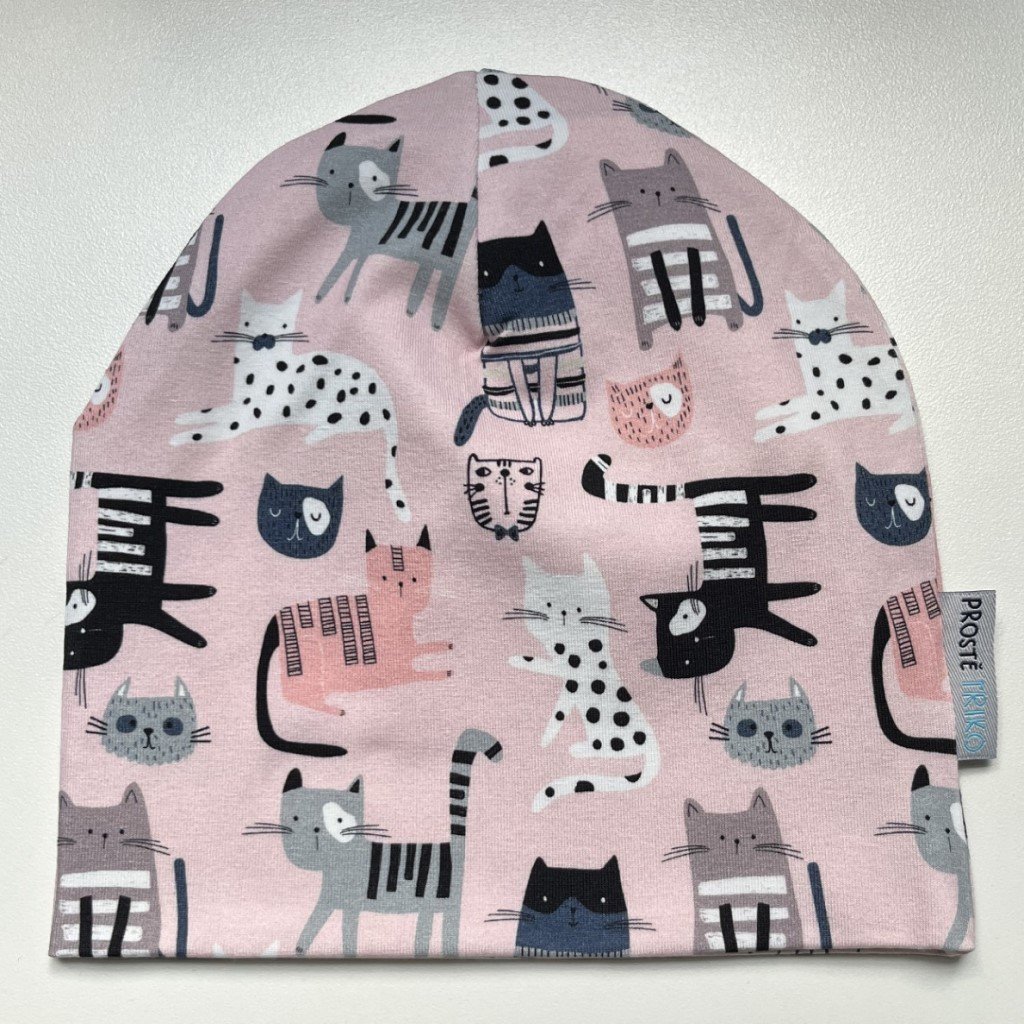 Originální čepice plná koček na jemném růžovém podkladu pro holčičky i maminky. Je ušita z dvojitého úpletu a díky malému přídavku elastanu velmi dobře pruží a drží si tvar i po mnoha vypráních.