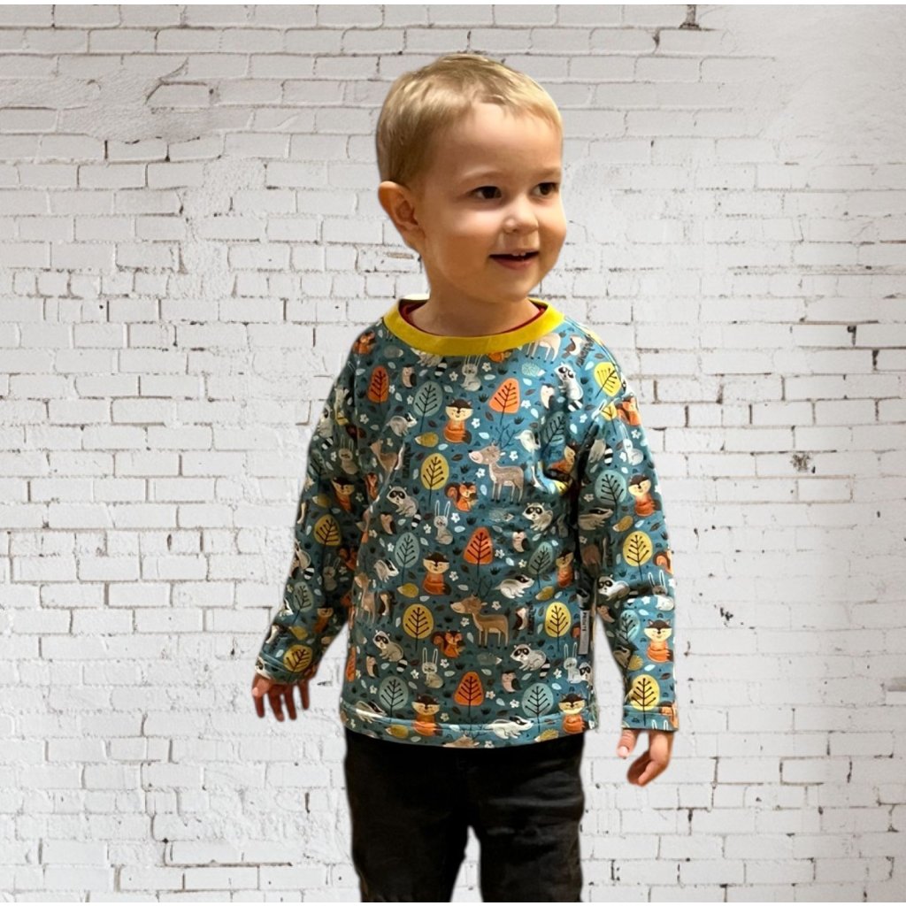 Mýval, datel, jelen, liška, zajíček, ... Slabší mikina se zvířátky na petrolejovém podkladu vaše děti určitě nadchne! Je vyrobená ze silnějšího bavlněného úpletu, který je velmi příjemný, a díky malému přídavku elastanu si drží svůj tvar i po mnoha vypráních.