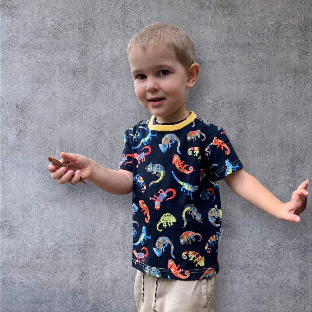Tričko plné chameleonů pro malé milovníky zvířat. Je ušito z velmi jemné a příjemné bavlny s přídavkem elastanu, takže se nemačká a nevytahuje a drží tvar i po mnoha vypráních.