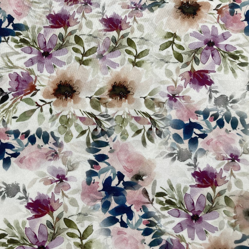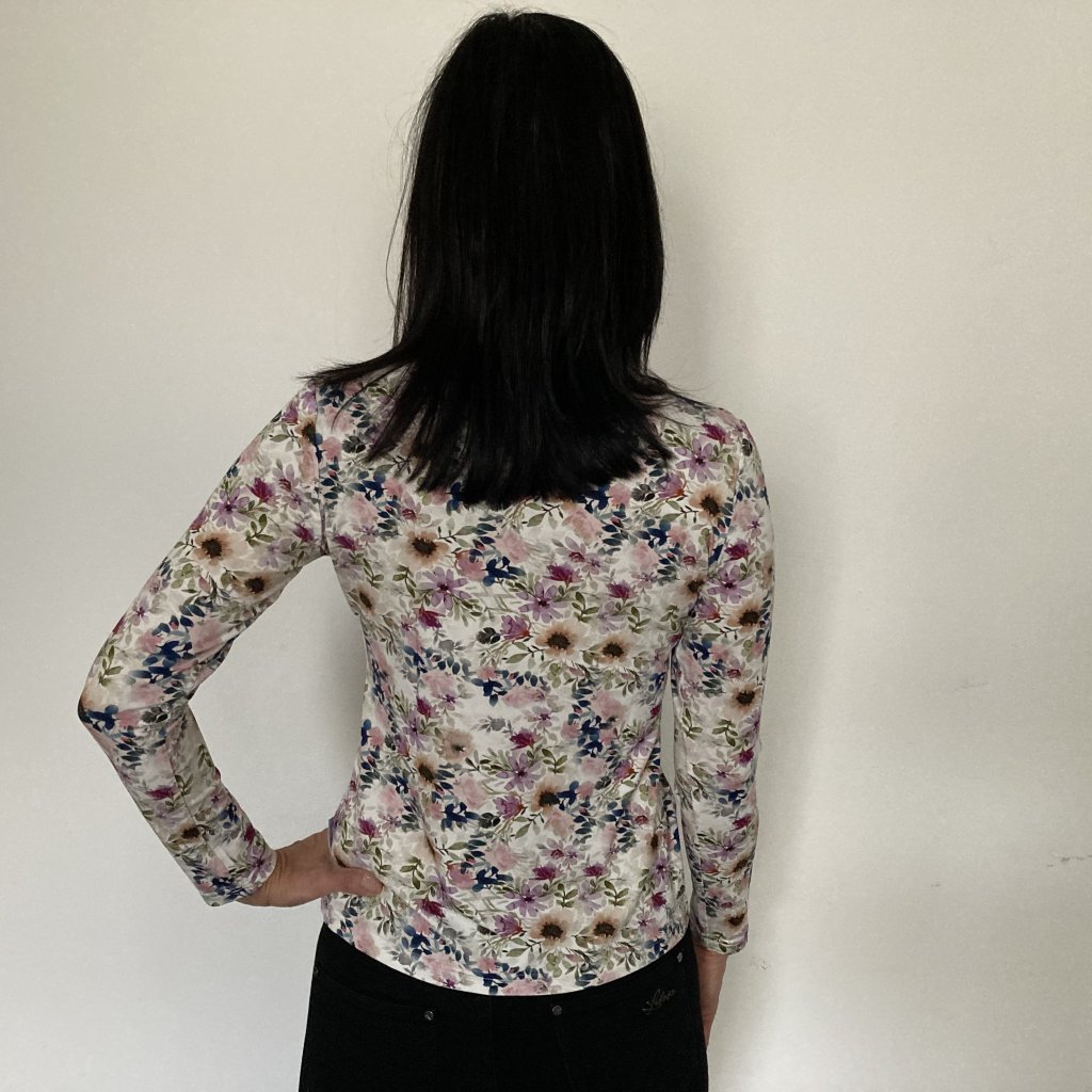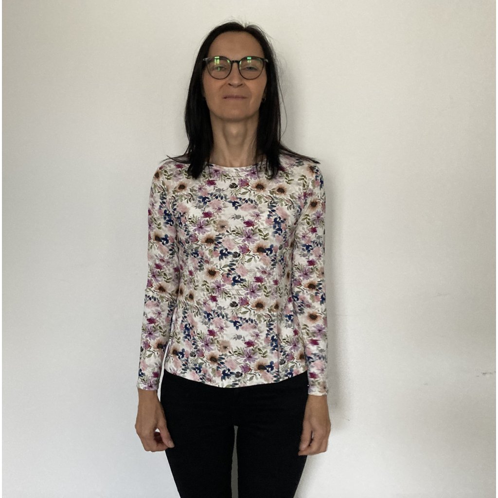 Romantické tričko plné květin v jemných růžových a fialových tónech. Je ušito z jemné viskózy a velmi příjemně se nosí. Díky malému přídavku elastanu drží tvar i po mnoha vypráních.