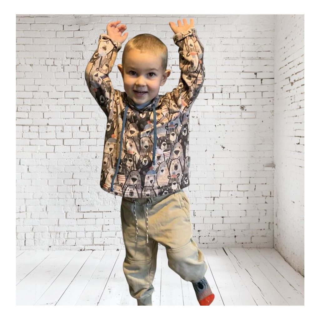 Huňatá mikinka s kapucí a spoustou přátelských medvědů je vyrobená z jemné bavlněné teplákoviny s příměsí elastanu, takže zahřeje v chladných podzimních i zimních dnech. Vázačka ke kapuce je ocelově modrá nebo lososově růžová. Do poznámky k objednávce zapište variantu, jakou variantu jste si vybrali.